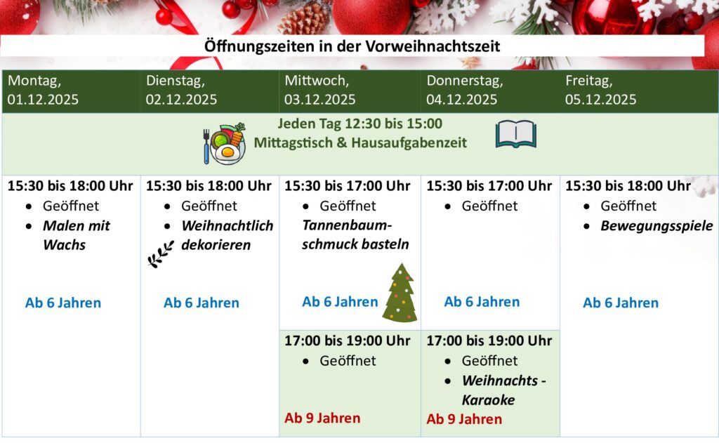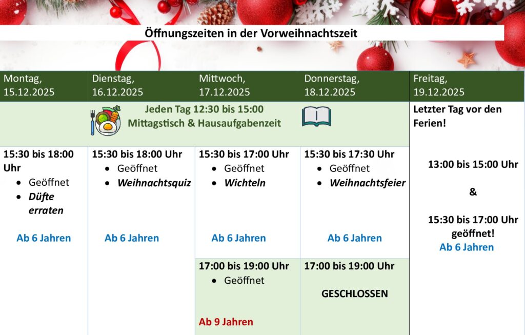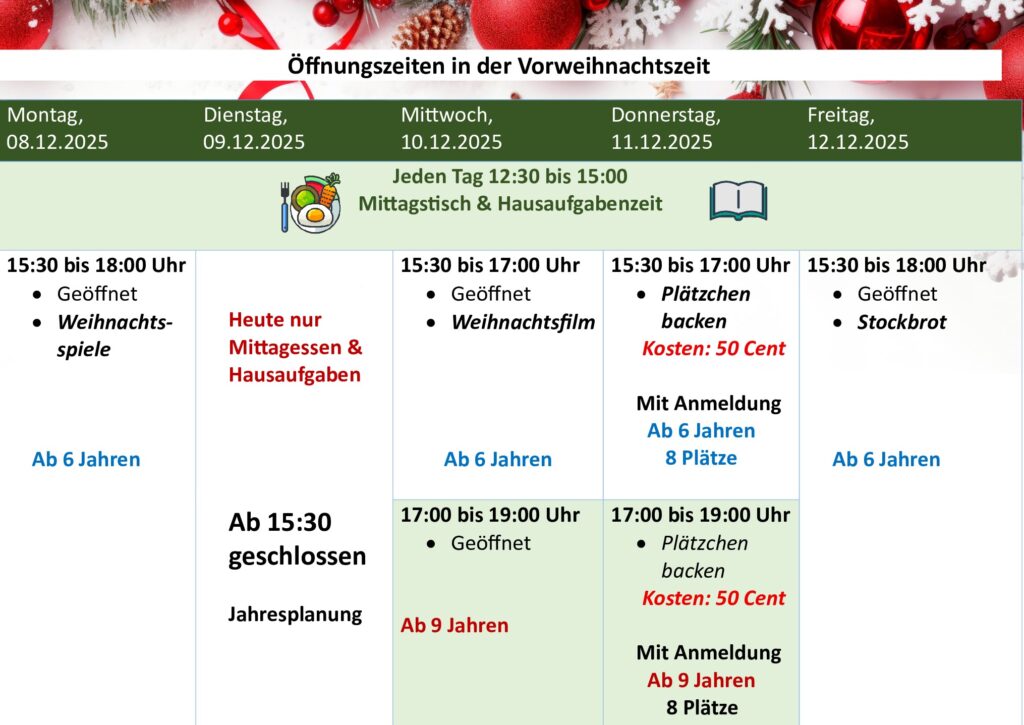Wir bieten in der Zeit von 12:30 bis 15:00 Uhr neben der Hausaufgabenzeit einen Mittagstisch an.